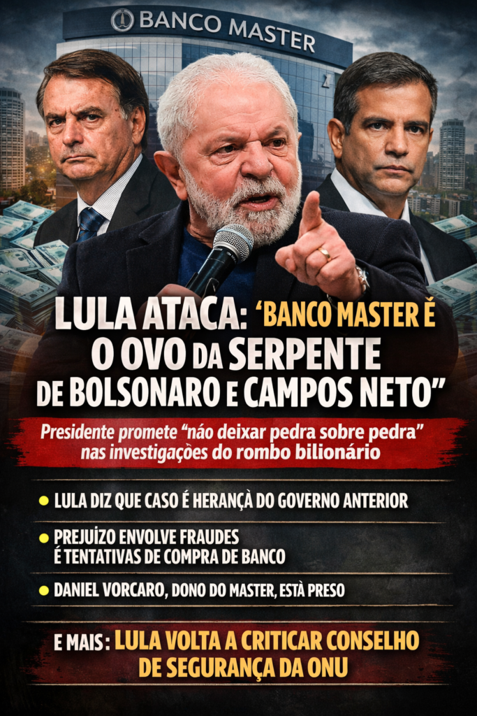 “Esse Banco Master é obra, é ovo da serpente do Bolsonaro e do Roberto Campos”, disse Lula, ao afirmar que o governo pretende aprofundar as investigações sobre o caso. O presidente também declarou que não permitirá tentativa de transferir ao seu governo a culpa pelos problemas envolvendo a instituição financeira.